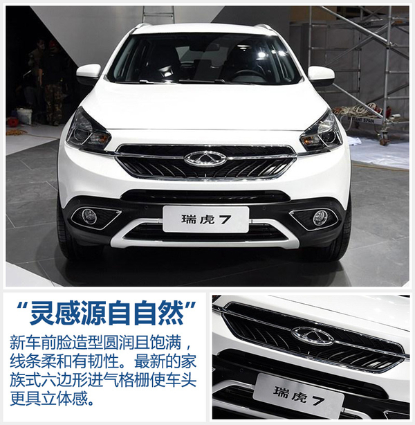 瑞虎TX的外形基本沿用了奇瑞自家概念车—TX的设计,TX概念车曾在2012年获得由欧洲“Auto®汽车设计大会”评选的“2012 汽车设计大奖”,同时它还获得过德国红点设计大奖的“2012 年度最佳概念车奖”。新车前脸造型圆润且饱满,线条柔和有韧性,进气格栅边缘采用镀铬饰条点缀,使前脸更显精致。最新的家族式六边形进气格栅使车头更具立体感,格栅中间贯穿式饰条向两侧延伸并与头灯相连。