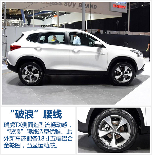 瑞虎TX侧面造型流畅且动感,车窗下沿的镀铬饰条提升整车档次感。灵感源自快艇运动的“破浪”腰线造型优雅,车顶拥有银色行李架。此外新车还配备18寸五幅铝合金轮圈,凸显运动感。