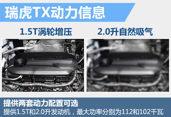 动力方面,瑞虎TX将配备1.5T涡轮增压以及2.0升自然吸气两种动力配置可选,前者最大输出功率为112千瓦,后者最大输出功率为102千瓦。传动系统方面,1.5T发动机仅提供手动变速箱;而2.0升发动机则将匹配CVT变速箱。据了解新车最快将于8月底正式上市。