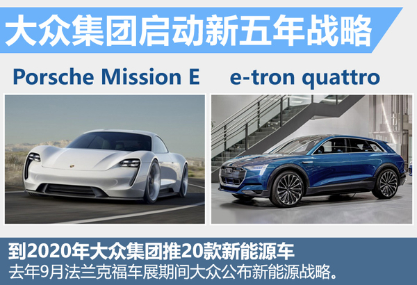 去年9月在法兰克福车展的大众之夜上,大众正式揭开未来发展的新序幕。针对新能源的布局,大众汽车集团管理董事会主席文德恩教授表示,到2020年前,大众将推出20款新能源车。其中,大众展示了保时捷的Porsche Mission E和奥迪的e-tron quattro,这两款车续航里程均超过500公里,并且充电时间15分钟至30分钟。根据大众规划,大众将成为电动汽车市场的领导者,将实现产品线中绝大部分车型导入新能源技术。除此之外,大众还将推进在华SUV产品的投放进度,逐渐实现扭亏为盈。