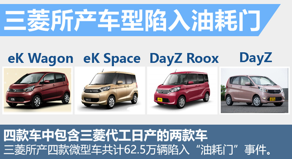 今年4月20日,三菱汽车社长相川哲郎在东京召开新闻发布会,承认在油耗测试中采用了不正当手段,使得燃油经济性测试结果好于实际情况,所涉及的四款车均为微型车(日本的轻车K-car),其中两款是三菱自己开发设计自己负责销售的,分别为eK Wagon和eK Space,共涉及15.7万辆。同时,三菱还利用现有生产线为日产代工生产两款车型,分别是DayZ和DayZ Roox由日产挂牌销售,共涉及46.8万辆。四款车型合计约62.5万辆。