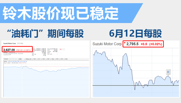 继三菱之后,铃木汽车也卷入了造假丑闻。受“能效门”影响,铃木汽车股票同样大跌,当日一度大跌15%,直至收盘才得以抑制继续下跌的可能,但其创下16年来的最大盘中跌幅。同时,由于今年业绩表现不佳,铃木汽车的股价本身已经下跌了31%。目前,铃木股价有所回暖,从5月18日的每股2627日元,截止到12日已涨回至每股2,795.5日元。
