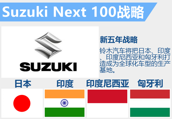 2015年7月1日,铃木修任命自己的儿子铃木俊宏为铃木汽车的新首席运营官和总裁。在铃木修辞职后,铃木俊宏将全面接管铃木汽车集团,并着力实施铃木的新五年管理计划“Suzuki Next 100”(从2015年至2020年)。目前,铃木的主要市场是日本和印度,其在日本市场的微型车占有率超过了30%,而在印度市场的乘用车占有率超过了53%。根据铃木全新规划,铃木汽车将把日本、印度、印度尼西亚和匈牙利打造成为全球化车型的生产基地。
