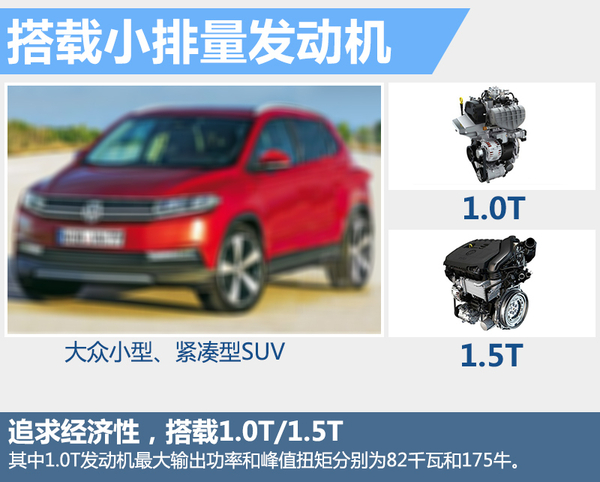 计划在一汽-大众和上汽-大众投产的小型、紧凑型SUV考虑到经济性因素,或将搭载大众新研发的1.0T、1.5T涡轮增压发动机,其中1.0T发动机最大输出功率和峰值扭矩分别为82千瓦和175牛米。另外新车将有可能匹配手动或DSG变速箱并选配4MOTION四驱系统。