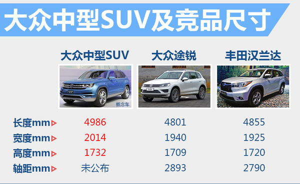 不同于小型、紧凑型车SUV的经济性目标,一汽大众与上汽大众投产的中型SUV将在尺寸上将进一步升级,长宽高尺寸分别达到4,986*2,014*1,732毫米,其外形尺寸将远超现款大众旗舰SUV(途锐),与目前广受关注的丰田汉兰达相比也有明显优势,两款中型SUV将有望设有7座版本。两家合资品牌所生产的两款中型SUV,尽管在外观上有相似之处,但细节部分将进行不同设计,其关系将类似于帕萨特与迈腾。