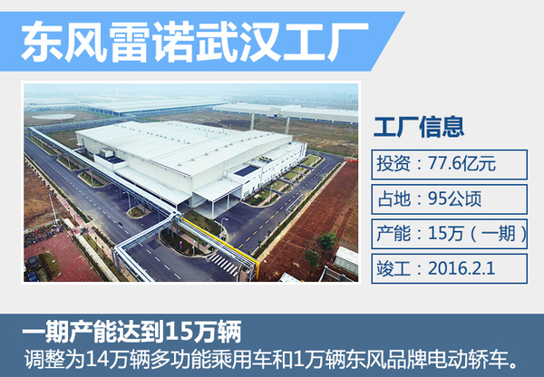 东风雷诺武汉工厂投资77.6亿元,位于武汉经济技术开发区黄金口产业园,占地面积95公顷,规划整车生产能力为年产30万辆。从2013年12月成立合资公司,到2015年5月武汉工厂设备调试完毕,第一款国产车型试制样车下线,仅用了16个月的时间。目前,一期产能已经具备了年产15万辆整车的能力。按照最近的规划,这15万辆产能的产品结构中,将有1万辆用于生产纯电动车型。