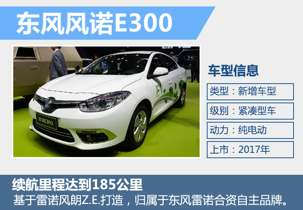 东风汽车公司在去年向国家工商行政管理总局商标局提交了“东风风诺”商标注册申请,而这一全新命名将归属于东风雷诺合资自主品牌。在今年的北京车展上,东风雷诺带来了一款紧凑级纯电动轿车,命名为风诺E300,基于雷诺早前在海外销售的纯电动车风朗(Fluence)Z.E.打造。这款纯电动车所搭载的锂离子电池组容量为22千瓦时,综合工况最大续航里程达到185公里,可实现最大功率70千瓦、峰值扭矩226牛米的动力输出。