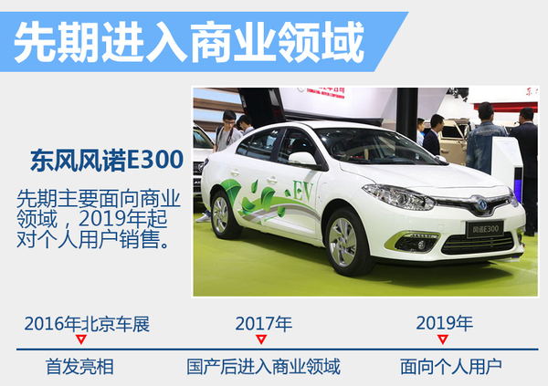 雷诺-日产联盟总裁兼首席执行官卡洛斯•戈恩先生曾表示:“日产汽车从启辰开始将纯电动汽车引入中国,雷诺也会开始将旗下纯电动车型引入到中国市场,兑现给中国市场带来电动车的承诺。”受到续航里程、电动车成本和充电设施的局限,风诺E300先期将主要面向商业领域,包括出租车、租赁、政府用车。随着电动技术、续航里程的提升、配套设施的完善,新车预计将从2019年开始面对个人用户销售。