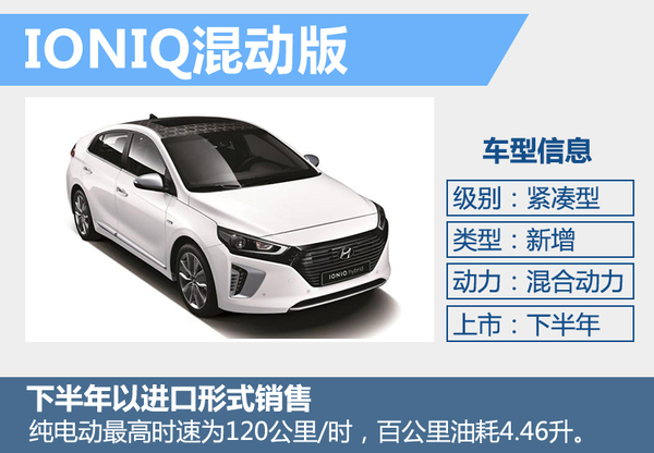 今年的北京车展上,现代汽车展出了IONIQ混合动力版车型。目前该车已在海外市场上市,将于今年下半年以进口形式销售,并有望国产。动力方面,IONIQ混动版的混合动力系统由1.6升GDI发动机(77千瓦、146牛米)与一台电动机(32千瓦)组成。传动方面,与混动系统匹配的是一台6速双离合变速箱。现代IONIQ在纯电动模式下最高时速为120公里/时,综合油耗预计能够达到4.46升/百公里。