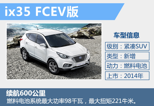 ix35 FCEV版搭载一套输出功率100千瓦的燃料电池系统,两个储氢罐,续航里程达600公里,最大功率98千瓦,最大扭矩221牛米,最高时速160公里/时,完全能够满足日常使用的需求。与普通燃油车型相比,ix35 FCEV另一大优势是在零下20°C的环境中依然能够正常点火行驶。