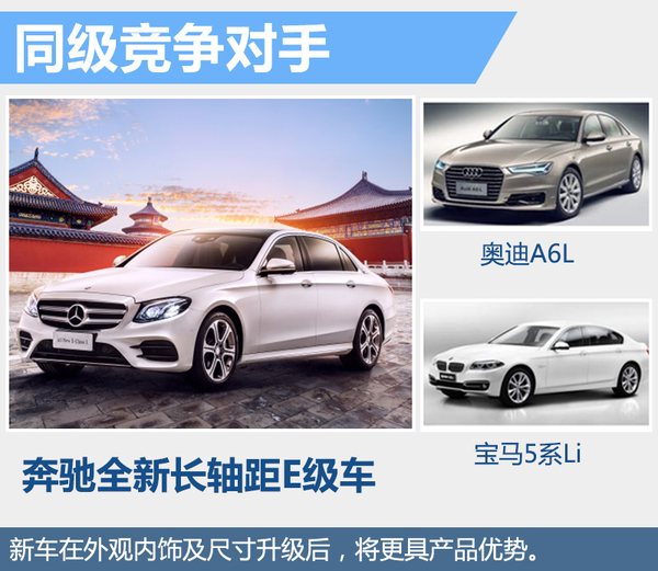 奔驰E级在市场上的老对手奥迪A6L在年初推出中期改款车型,另一款宝马5系也到了产品周期的末期。此次奔驰E级率先出击推出全新换代产品的长轴距版,并在外观和车身尺寸上都向S级产品靠拢,抓住中国消费者的需求心理,以在该级别豪华车市场中占据更大的份额。
