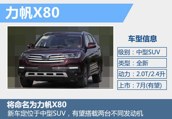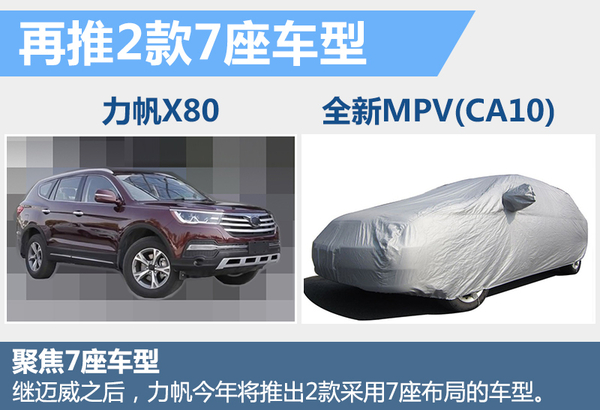 力帆旗下产品此前以轿车为主,紧凑型7座SUV迈威上市销售后,开启战略转型的序幕。重庆力帆集团副总裁兼国内汽车销售公司总经理马可表示:“继迈威之后,力帆还将推出几款品质更高的7座多功能家用车,这些车型在细分市场中定位更加精准。“另据网通社获得的信息,力帆旗下包括全新7座中型SUV X80和全新7座MPV在内,均有望在下半年正式上市。