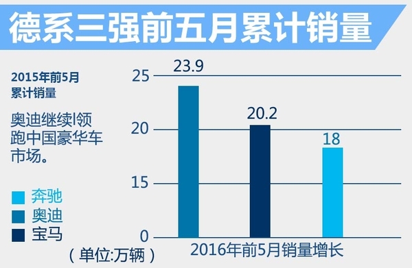 根据奥迪、宝马以及奔驰三家豪华车品牌公布的前5个月销量业绩,奥迪继续领跑中国豪华车市场,总销量达到239,118辆,相比去年同期增幅达到5.8%;宝马位居第二,在华销量达到202,344辆,对比去年同期增幅达到6.3%;奔驰排名第三,但销量增速远超另外两品牌,前5月总销量为180,537辆,同比增长35.9%,不断缩小与奥迪和宝马两大豪华品牌在华的销量差距。
