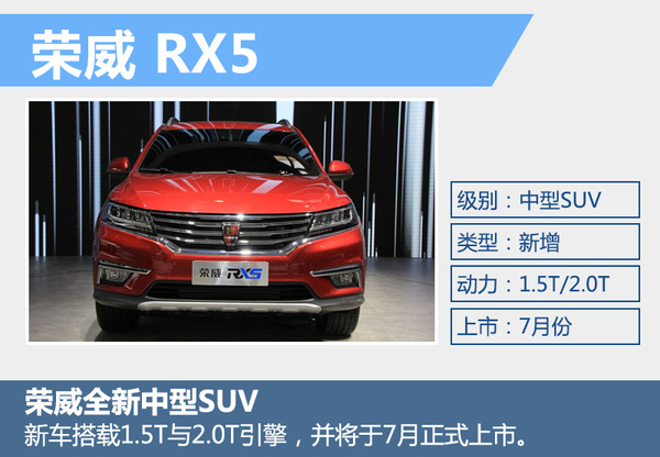 动力方面,荣威RX5将搭载1.5T和2.0T两款发动机,其中1.5T发动机最大功率为124千瓦,为前置前驱车型;2.0T发动机最大功率为162千瓦,分前置前驱和四驱两种驱动形式。与发动机匹配的是一台5档手动和6速双离合自动变速箱。此外,新车未来还将提供“绿芯”插电式混合动力和纯电动车型。