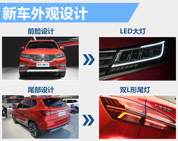 外观方面,荣威RX5前脸运用最新的“律动设计”设计语言,前格栅与前大灯组成飞翼式造型。前大灯为矩阵式LED结构,内部由24颗LED光源组成,灯组内部还集成“如意形”日间行车灯。尾部方面,荣威RX5的尾部设计极具层次感,同样采用LED光源,灯组较小,牌照框上部一根镀铬装饰条贯穿左右,保险杠底部搭配有了银色护板,排气布局为双边共两出形式。