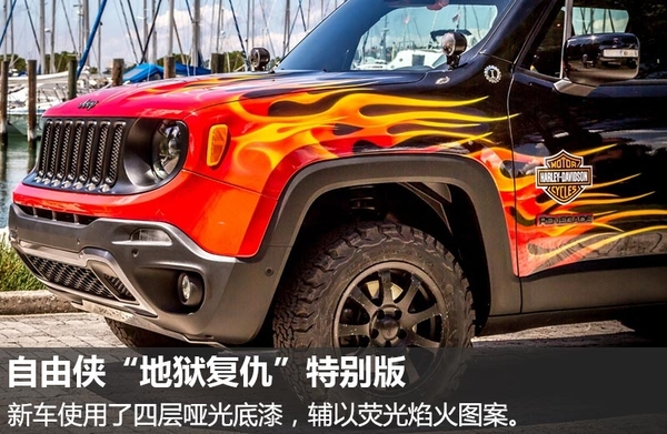 全新自由侠“地狱复仇”特别版是由Jeep和哈雷共同打造的车型,为了庆祝第25届欧洲哈雷买家集会(H.O.G Rally)而推出。新车使用了四层哑光底漆,辅以荧光焰火图案,并且在车身最外层喷涂透明保护性漆料,在视觉效果上类似由喷枪进行喷涂的摩托车油箱,同时也颇有电影《恶灵骑士》中火焰战车的风采。
