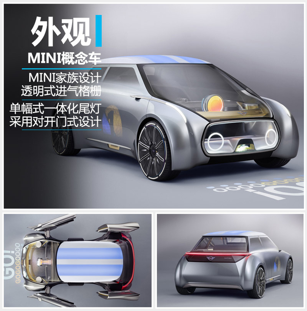 MINI作为具有纯正的英国血统的汽车品牌,在此次发布的MINI VISION NEXT 100概念车在外观设计上同样保留MINI的英伦范儿,例如:车身采用MINI经典线条打造,并配备全新透明式进气格栅,造型方面依旧沿袭MINI家族式隔栅造型设计。全新MINI概念车为一款五门掀背车,并采用对开门式设计。新车尾部配备单幅式一体化尾灯,使新车在外观上看起来更加简洁。