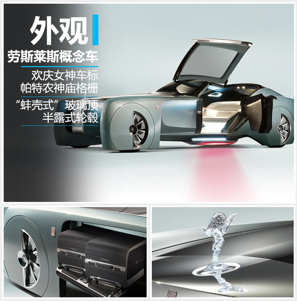 劳斯莱斯全新概念车的车身长5.9米,高1.6米,与现款长轴距版幻影尺寸相当。车身可分为上下两部分,上部分采用“蚌壳式”的黑色玻璃顶篷,一直延展汇入发动机罩;下半部分采用丝绸质感“结晶水”配色方案,与车顶形成强烈的反差视觉效果。Rolls-Royce VISION NEXT 100搭配28英寸半露式轮毂,在前翼子板部位新增两大储物空间,能在乘客到达和离开时自动打开。