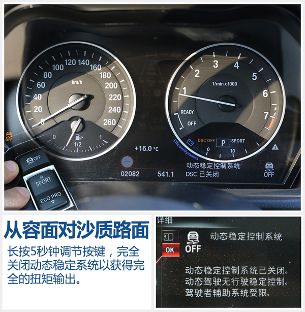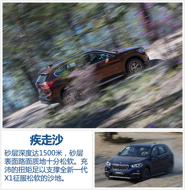 在此次的试驾体验当中,800米左右的沙地行驶经历令人印象深刻。根据当地导游的介绍,沙地路段砂层的深度达到了1500米,在砂层表面路面质地十分松软。这时需要长按5秒钟调节按键,完全关闭动态稳定系统以获得完全的扭矩输出。老话说,疾走沙、慢行水,充沛的扭矩足以支撑全新一代X1征服松软的沙地。