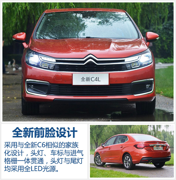 新款C4L在前脸部分采用与雪铁龙全新C6十分相似的设计,大灯组、车标和进气格栅一体贯通,雾灯区域“C”型镀铬装饰条与下进气格栅贯通,大量横直线条起到拉伸视觉效果的作用,这预计将成为雪铁龙最新的家族式设计语言。