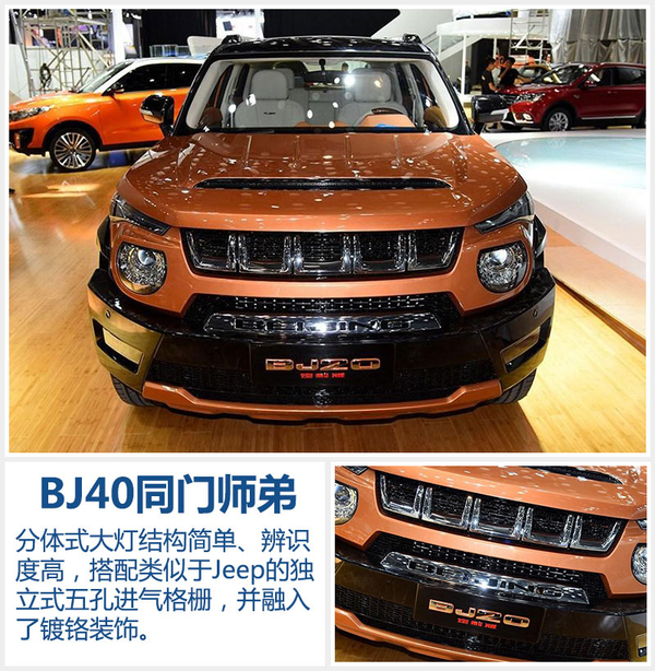 身为BJ40的“同门师弟”,BJ20很好地传承了北汽“越野世家”传统的硬派外形,并在此基础上融入了一些带有未来感的前沿设计。新颖的分体式大灯结构简单、辨识度高,搭配类似于Jeep的独立式五孔进气格栅,并融入了镀铬装饰,看起来更加大气、硬派,更具视觉冲击力,但在车身尺寸上要明显小于BJ40。