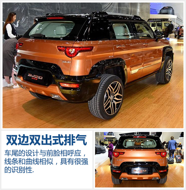 车尾的设计与前脸相呼应,线条和曲线相似,具有很强的识别性。双边双出式排气设计为整车再添一丝运动气息。北汽BJ20整车尺寸分别为4451/1845/1675(含行李架为1700)毫米,轴距达到2670毫米。