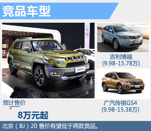 北京(BJ)20定位于紧凑型SUV,未来新车上市后将与广汽传祺GS4、吉利博越所在的紧凑型SUV市场车型展开竞争。网通社预计其起售价格为8万元,相比于竞品车型BJ20凭借其源自“越野家族”的硬派传承和军工品质,有望吸引更多越野爱好者。
