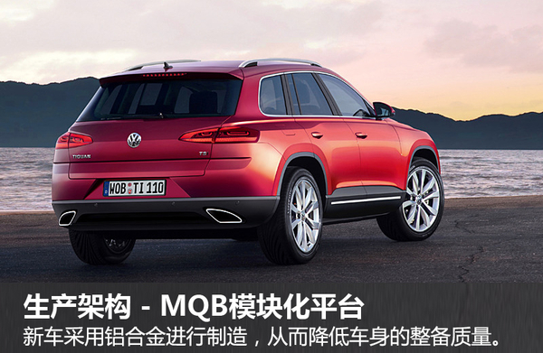在制造平台方面,大众全新一代途观XL将采用MQB模块化平台打造。在增加车身轴距后,保证了驾驶者舒适性及安全性,进而提升车辆在高速行驶时的稳定性。此外,新车还将采用铝合金等轻量化材料打造车身覆盖件,在一定程度上降低车身的整备质量,降低油耗。