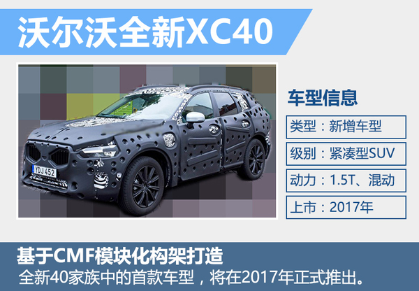 沃尔沃全新40系列基于CMA紧凑型模块化架构打造,全新XC40预计会采用40.1概念车的设计理念,搭载全新的1.5T三缸涡轮增压发动机+7速双离合的动力组合。新车推出后,将与奔驰GLA、宝马全新一代X1展开竞争。此外,沃尔沃有望在XC40的基础上推出轿跑风格的Coupe车型。