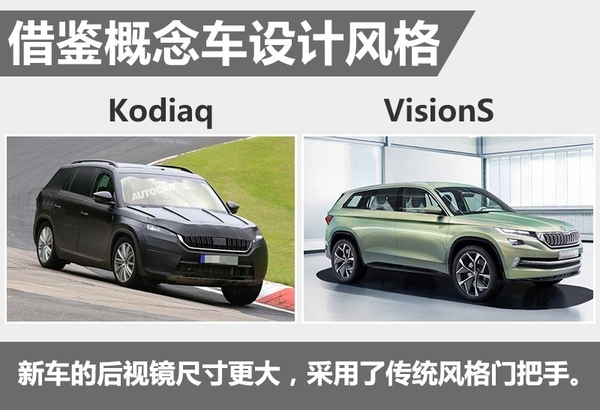 斯柯达全新SUV Kodiaq将大量借鉴VisionS概念车的设计元素,同时对中网造型进行微调。新车后视镜尺寸更大,采用传统风格的门把手,翼子板的肌肉感十足,车顶还配有行李架,而尾部则使用了一体式扰流器。此外,新车还有望配备氙气头灯、LED日间行车灯以及LED尾灯。