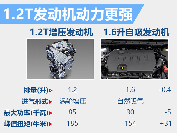 卡罗拉1.2T搭载的这台代号为8NR-FTS的1.2升涡轮增压发动机,最大功率为85千瓦,峰值扭矩185牛米。虽然相对于1.6升自然吸气发动机来说在最大功率方面稍弱一筹,但其扭矩更高,在1500到4000转之间都可以达到峰值扭矩。这款发动机还采用了丰田VVT-iW可变气门正时技术,可以在特定工况下进入阿特金森循环,提高燃油经济性。