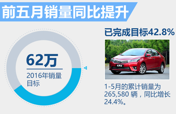 今年,一汽丰田的销量目标定为62万辆,相比2015年的销量目标高出1万辆。1-5月累计销量为265,580辆,同比增长24.4%,已完成全年销量目标的42.8%。5月销量为58,962辆,同比增长6.3%,较之4月的53,362辆,环比增长9.5%。其中,享有小排量车购置税减半优惠政策的卡罗拉车型,5月销量达到24,400辆,同比上涨20.7%。