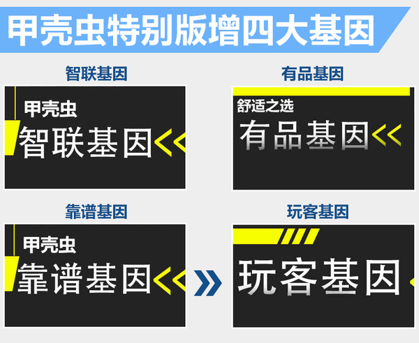 除了专属的外观套件,在鹿晗X甲壳虫跨界版车型上的配置也进行了丰富,以380TSI 鹿晗X跨界版车型为例,在新车上增加了四大甲壳虫基因,分别为“玩客基因”、 “有品基因”、“靠谱基因”、“智联基因”,涉及配置达12项。