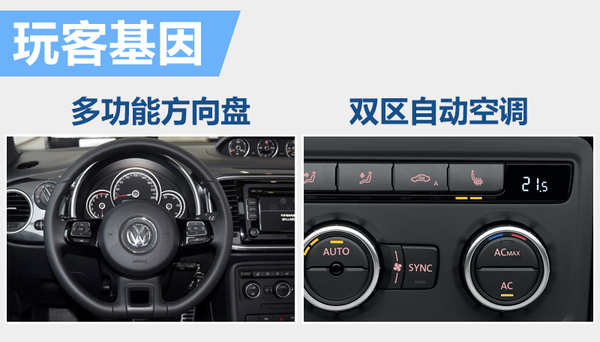 “玩客基因”是甲壳虫所属基因中配置最实用的一项。这项基因包含了多功能方向盘以及双区自动空调系统,可为用户提供更为舒适便利的使用感。其中“Climatronic”双区自动空调为用户“量身定制”最舒适的温度,保证了驾驶员在车内的舒适性。