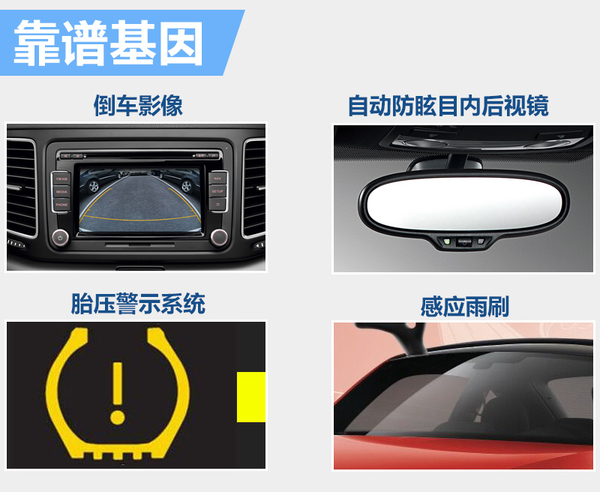 “靠谱基因”中包含四项配置。其中感应雨刷配置,在前挡风配有雨水感应探头,可根据天气情况自动激活雨刷器,同时雨量大小调节摆动频率;防炫目后视镜可对车后方远光灯及时作出处理,减小行车过程中后放远光灯对驾驶员的影响;胎压监测系统,在轮胎压力异常时,监控系统能够及时报警;倒车影像则解决很多驾驶新手的困扰,顺利的进行倒车和泊车入位。