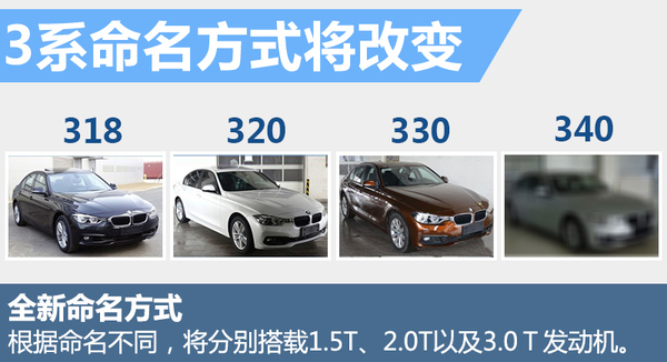 此次改款宝马将使用新的命名方式,其中318(原316)车型将搭载全新1.5T发动机,320和330(原328)车型则分别搭载低、高不同调校的2.0T涡轮增压发动机,尽管宝马尚未公布其搭载3.0T发动机的车型名称,但根据最新宝马4系的命名方式,现款335或将更名为340。以上车型将均有可能设立标准轴距和长轴距版。
