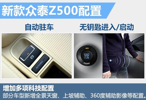 配置部分,2016款众泰Z500部分车型将增加ESC车身稳定系统、上坡辅助、胎压监测、定速巡航、车载蓝牙、全景天窗、360度辅助影像、车道偏离预警及自动恒温空调等配置。此外,新车有望全系标配BOS刹车优先、Auto Hold自动驻车、EPB电子驻车、无钥匙进入、无钥匙启动、多功能皮质方向盘、发动机防盗锁止、车身防盗报警等功能。