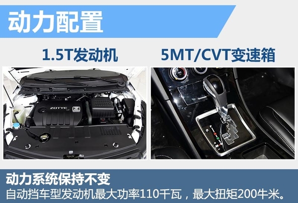 动力方面,2016款众泰Z500依旧搭载一台1.5T涡轮增压发动机,与发动机匹配是一台5速手动或CVT自动变速箱。其中自动挡车型发动机最大功率为110千瓦,最大扭矩为200牛·米,动力水平与同级别处于同一水平。