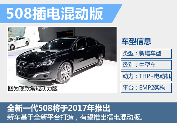 508定位于中型车,是目前东风标致旗下尺寸最大、级别最高的轿车产品。现款508基于PSA 3号平台进行打造。根据官方公布的消息,标致全新一代508将在2017年正式推出。新车将基于EMP2模块化平台进行打造,由东风标致进行本土化生产。在转用EMP2平台之后,全新一代508将具备推出插电混动版本的能力。未来插电混动版车型推出后同样有望在华实现投产。