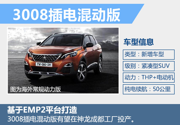 | 东风标致 | 全新一代3008 插电混动版 | 紧凑型SUV | 2019年 |