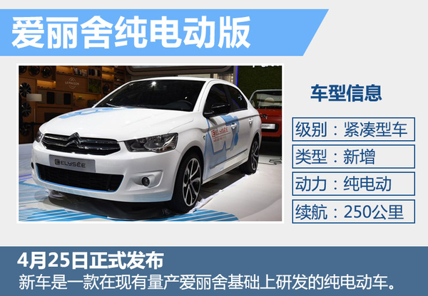 | 东风雪铁龙 | 爱丽舍 EV 纯电动版 | 紧凑型轿车 | 2017年 |