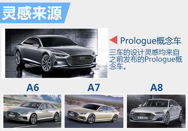 除全新Q5外,奥迪还将于2017年陆续换代旗下高端轿车,包括A6、A7以及A8。三车的设计灵感均来自之前发布的Prologue概念车,使用更加锋利的线条以突出力量感。除此以外,三车将均使用大众MLB Evo模块化平台,三车将在某些方面具有很高的通用性。