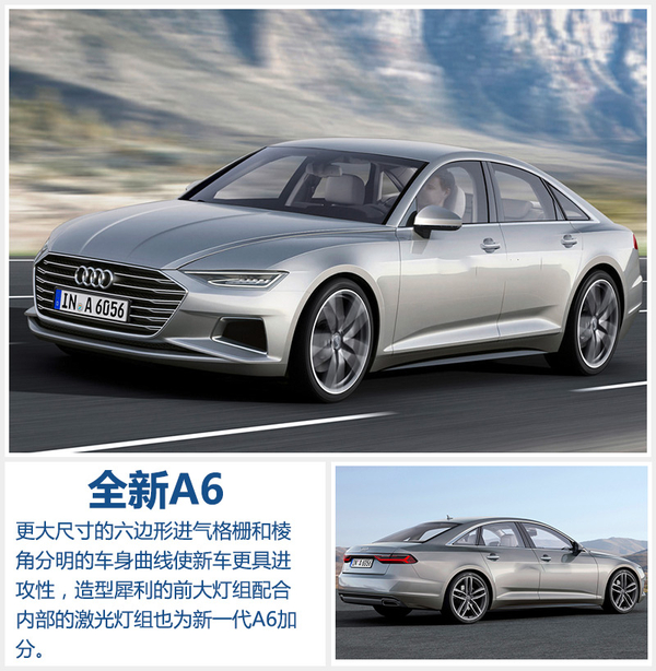 通过假想图可以看出新一代A6与目前奥迪家族风格有明显区别,更大尺寸的六边形进气格栅配以棱角分明的车身曲线,使得新车更具有进攻性,造型犀利的前大灯组配合内部的激光灯组也会成为新一代A6的加分点。