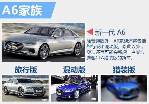 全新一代A6上市后还将有多款衍生车型与大众见面,包括Avant旅行车版(allroad quattro),近期将要上市的A6L e-tron也将随之进行换代。除此以外,奥迪还有可能会新增一台类似奔驰CLA猎装版的新车,该车型将具有更加动感的造型。