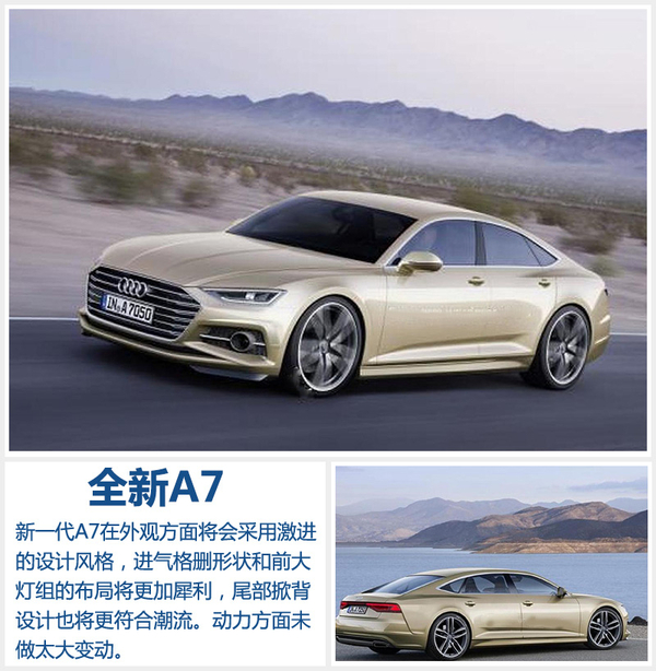 同样采用大众第二代MLB平台的全新一代A7在外观方面将会采用激进的设计风格,包括进气格栅形状以及前大灯组的布局都将变得更加犀利,尾部的掀背设计也将变得更符合潮流。动力方面或将在现有发动机(1.8T/2.0T/3.0T)的基础上进行优化。