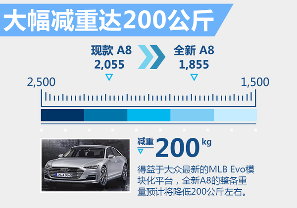 作为奥迪目前的旗舰轿车产品,新一代A8将与A6、A7一样采用大众MLB Evo平台,同时使用大量的高强度钢和铝合金等轻质材料,其重量将降低200公斤左右,减重后将与现款A6L重量相当,可想而知其燃油经济性和操控性将进一步提升。