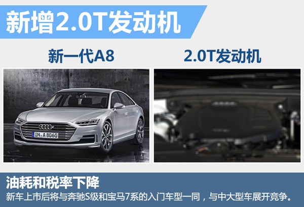 动力方面,全新一代A8除现在匹配的3.0升机械增压、4.0涡轮增压和6.0涡轮增压外,还有望新增一款2.0涡轮增压引擎作为入门引擎,其油耗和税率将进一步降低。搭载2.0T的新车上市后将与奔驰S级和宝马7系入门车型(S260/730Li)一同,与中大型车展开竞争。