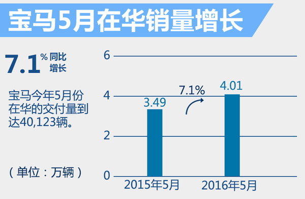 根据官方公布的信息,宝马今年5月份在华的交付量到达40,123辆,与去年同期在中国市场34,870辆的交付销量相比,同比增长7.1%。另外,相比去年5月份同比下跌5.5%的销量成绩,今年宝马实现了正向7.1%的增长,将推动今年整体的销售业绩。