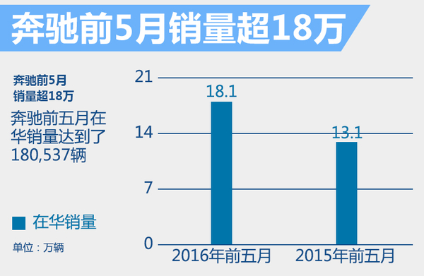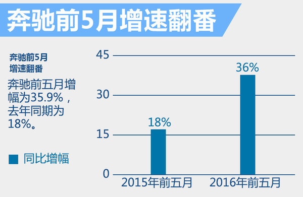 另外,再看5月份单月销量,奔驰在华共销售整车38,271辆,同比增长达到38.9%,是全球增长率的3倍,未来中国市场的重要性不言而喻。奔驰将在2016年余下的半年时间中继续投产多款新产品,为销量的持续增长起到积极作用。