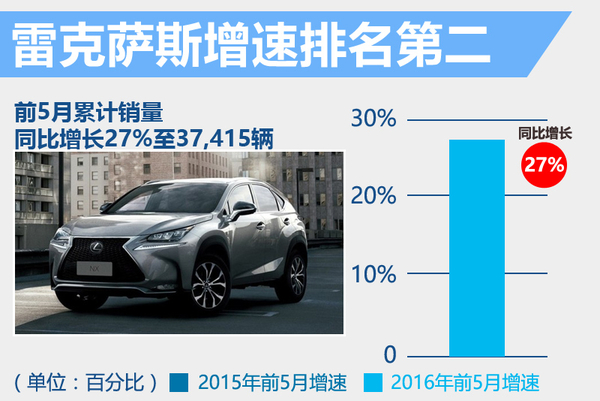 由于受到日本熊本县地震影响,日系豪华品牌中雷克萨斯5月的销量仅为4,906辆,不及订单量的一半。今年前5月累计销量同比增长27%至37,415辆,再次成为目前国内市场增速排名第二的豪华车企。据雷克萨斯此前公布的2016年销量目标,2016年雷克萨斯计划在华销售10万辆车,目前完成率为37.42%。